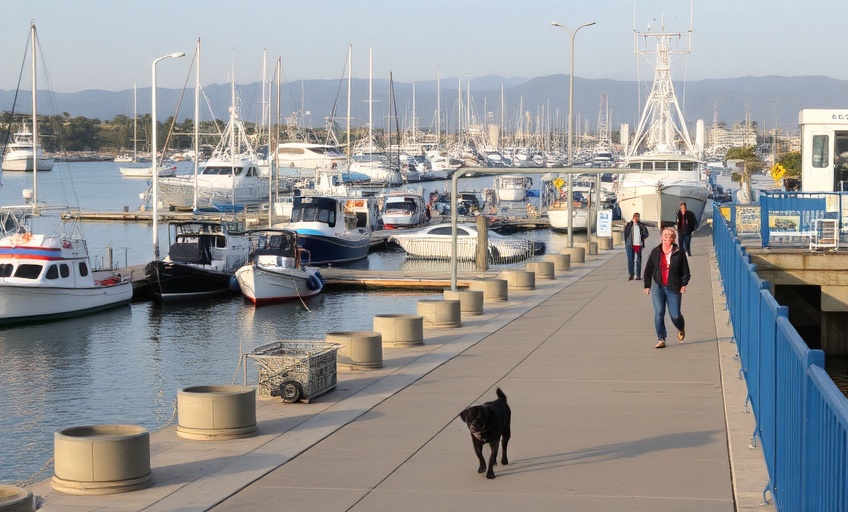 Active harbor area with waterfront walkways and maritime atmosphere.